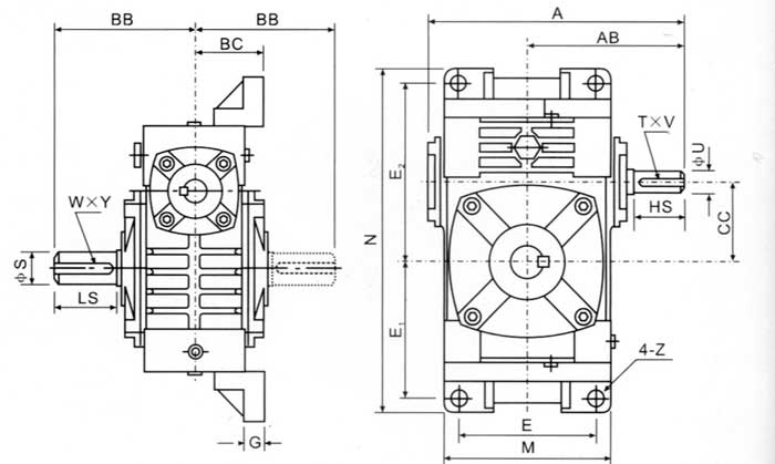 WPWKV40、WPWKV50、WPWKV60、WPWKV70、WPWKV80、WPWKV100、WPWKV120、WPWKV135、WPWKV155、WPWKV175、WPWKV200、WPWKV250、型蝸輪蝸桿減速器主要尺寸